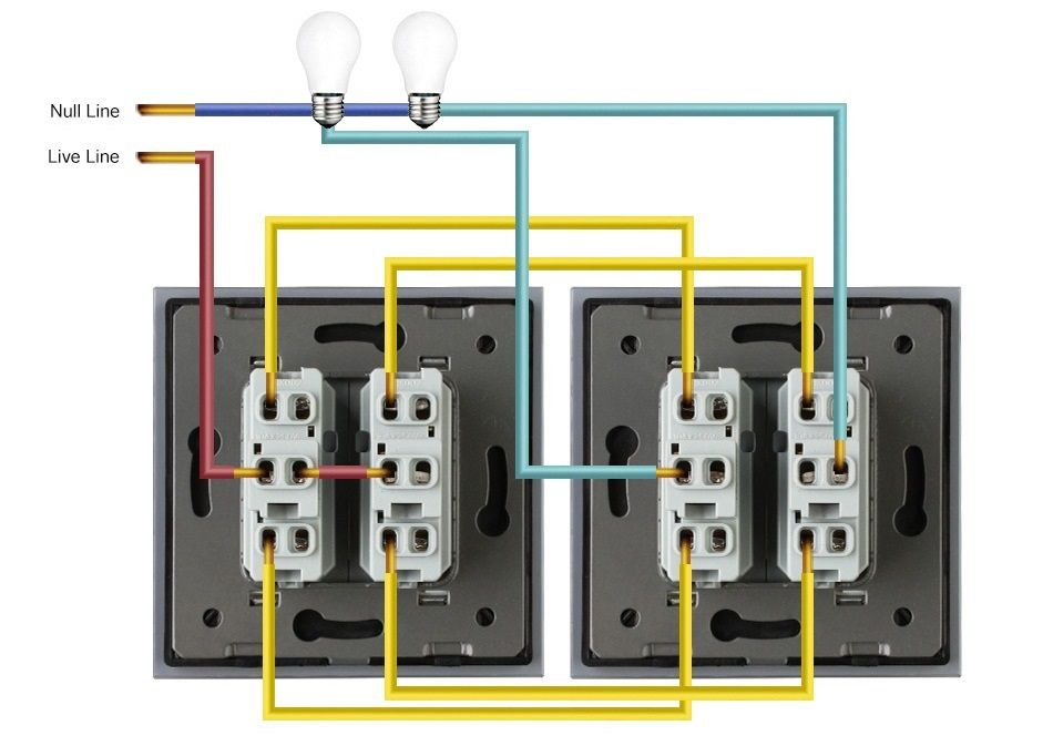 В результате правильного подключения первая клавиша будет включать одну лампу, вторая две, а две включенные клавиши приведут к активизации всего осветительного прибора. В выключенном состоянии должен светиться светодиод (+)