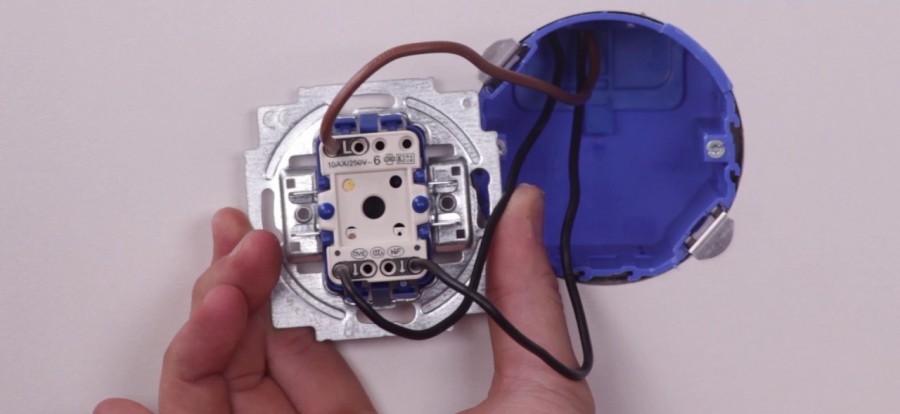 Если не брать во внимание подключение подсветки, монтаж проходит как в обычном устройстве. Через распаячную коробку на выключатель ведут фазный проводник и подсоединяют его к входной клемме L, заводя его в отверстие и прикручивая винтом