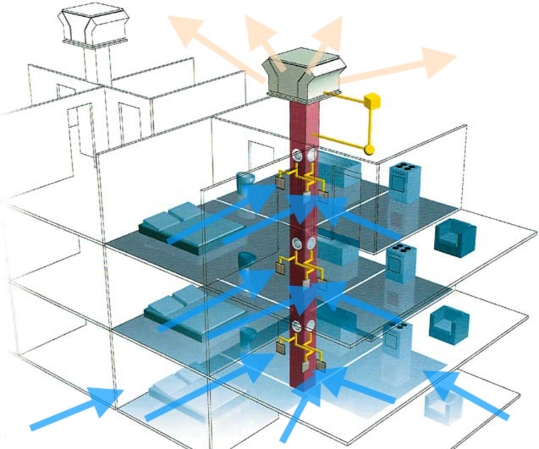Санитарными требованиями на сегодняшний день предусмотрен монтаж в жилых помещениях специальных агрегатов, обеспечивающих должный уровень воздухообмена. Для выполнения этих норм в многоэтажных постройках обустраивают вентиляционную систему. Последняя представлена в виде заранее продуманной цепочки каналов, которые располагаются в стенах и способствуют отхождению воздушных масс на крышу.