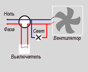 Огромный плюс такой схемы подключения — это простота исполнения и относительная дешевизна, но есть недостаток, это работа вентилятора когда этого не требуется, во время водных процедур создается сквозняк, недостаточное время проветривания помещения, в результате чего приходится оставлять освещение на дополнительное время. Кроме того такой режим работы снижает ресурс двигателя, поскольку запуск мотора сопровождается износом электрической части и механической. А частое включение и выключение его сокращают.