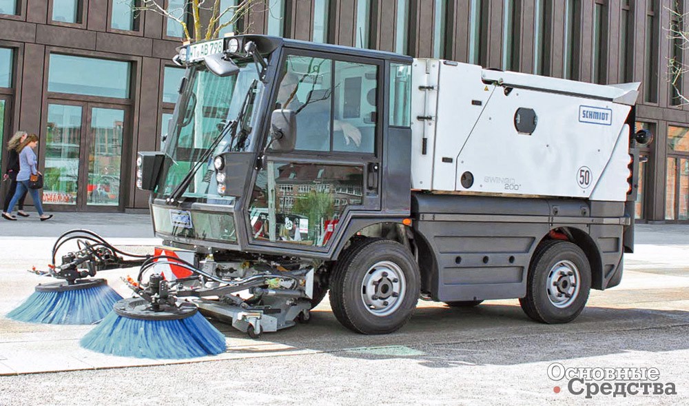 Например, вакуумная подметально-уборочная машина Schmidt SWINGO 200+ 2-brush массой 4500 кг, с бункером емкостью 2 м3, системой рециркуляции воды может обрабатывать полосу шириной 1400–2500 мм, за счет выдвижения вперед и в стороны тарельчатых щеток большого диаметра позволяет увеличить ширину уборки до 2900 мм. Предназначена она для уборки дорог, тротуаров, парковочных и промышленных территорий. Узкоколейное шасси с гидростатическим приводом на задние колеса. Подруливающие задняя и передняя оси обеспечивают высокую маневренность. Рабочая скорость – до 12 км/ч, транспортная – до 50 км/ч.