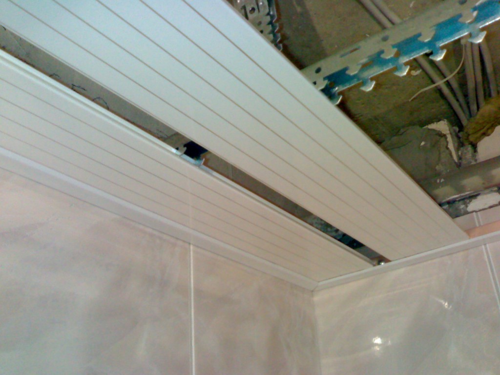 Перед тем, как установить реечный потолок, вы должны нарезать панели нужной длины. Для этого их необходимо сделать на 3-5мм короче, чем есть расстояние между профилями, в которые будут вставлены торцы панелей. После этого можно приступать к сборке потолочной поверхности. Панели вставляются в пазы стрингеров до щелчка, который свидетельствует о том, что края реек плотно зафиксировались на язычках шины.