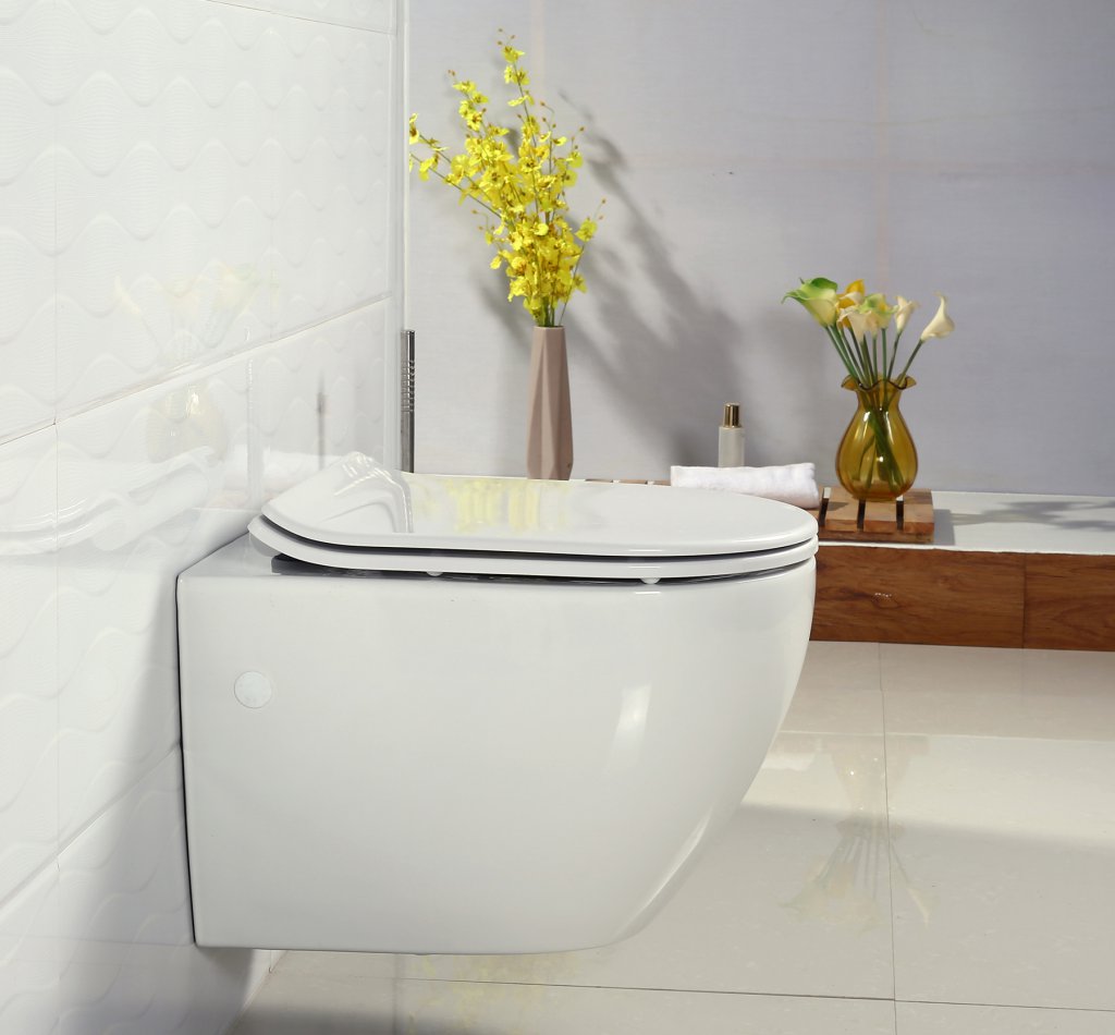 - Awe от AM. PM – это люксовая модель безободкового подвесного унитаза, выполненная в прекрасном дизайне с оглядкой на практичность и комфорт. Унитаз изготовлен из керамики высокой пробы, размеры изделия составляют 33х36,5х56 см, примерная стоимость – 710 долларов.