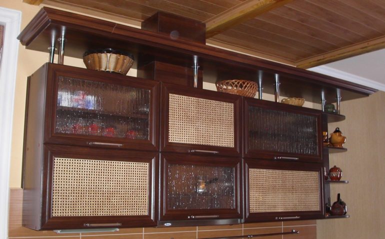 Очень интересно смотрится ротанговое полотно на фасадах. Для работы необходимо отмерить и отрезать нужный кусок и замочить материал в холодной воде. Спустя полчаса оно набухнет и немного увеличится в размерах, так будет проще обновить изделие. Влажный ротанг необходимо приложить к поверхности, разгладить, натянуть и зафиксировать по краям мебельным степлером. Такое крепление более надежно, однако при желании можно применить суперклей или ПВА. После этого следует приложить по периметру планки, состыковать их друг к другу под углом 45 градусов и прибить гвоздями без шляпок. Подобные молдинги закроют видимые крепления и придадут гарнитуру целостный и гармоничный внешний вид. После высыхания ротанга он будет выглядеть словно натянутая струна.