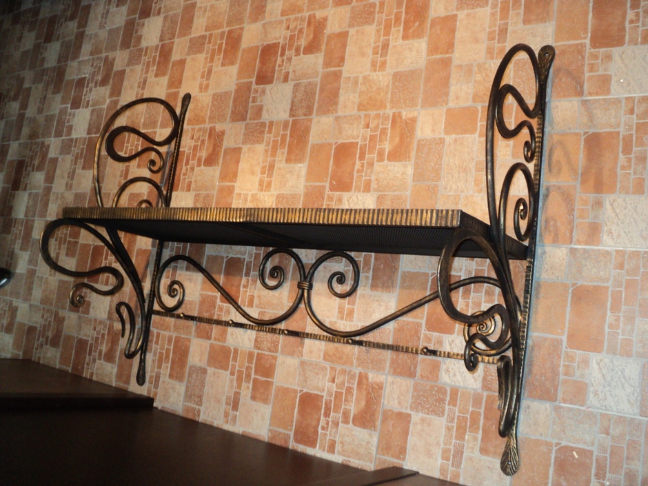 Изысканно и изящно выглядит мебель из кованого железа. Она отличается великолепной прочностью и износостойкостью. Обычно изготавливается на заказ. Кованые полки и этажерки могут быть любой формы и конструкции.