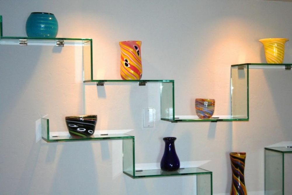 Стеклянные полки на стену в прихожей, как на фото ниже, смотрятся изысканно, легко, воздушно. Они украшают интерьер. Многие люди не устанавливают стеклянные полки, так как переживают, что они хрупкие и легко бьются. На самом деле современное стекло обладает высокой прочностью. Толстое закалённое стекло устойчиво к ударам и может выдержать большую нагрузку. К преимуществам стеклянных полок также можно отнести: