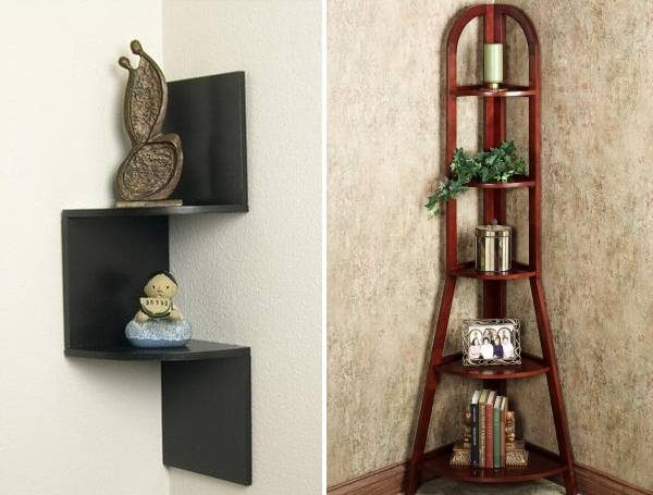 Многоярусные угловые полочки помогают значительно сэкономить место. Это хороший вариант для тесных помещений, где нужно разместить большое количество вещей. Подходят для хранения практически всего. При большой вместительности занимают минимум пространства и не мешают движению. Удачно смотрятся в любом интерьере, подходят для любого дизайна. Могут быть закрытые и открытые, навесные и напольные (этажерки).