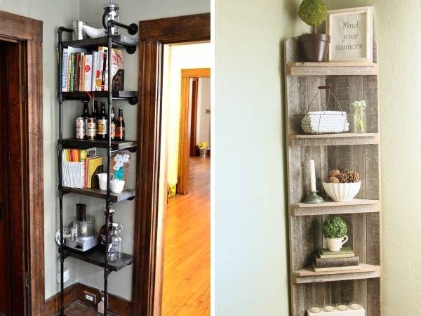 Такие конструкции могут быть установлены на стене, в форме навесных полок, или располагаться на полу. Также угловые полки могут быть открытыми или закрытыми. Преимуществом закрытых угловых полок является то, что с помощью дверок можно будет спрятать от взгляда окружающих некоторые вещи или просто накопившийся хлам, который жалко выбросить. А открытые же угловые полки наоборот помогут продемонстрировать гостям какие-нибудь красивые сувениры, картины, фотографии. Хоть и с первого взгляда может показаться, что угловые полки очень маленькие и туда ничего не вместится, это ошибка. Огромный плюс угловых полок – это их вместительность и то, как они могут заполнить незаполненный, некрасивый угол с пользой и даже, возможно, подчеркнуть общий стиль интерьера.