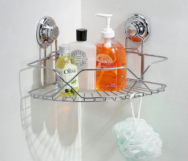 Полки угловые на присосках, в конструкции которых есть вешалка для мочалок и решетка, очень удобны в использовании, хотя иногда дешевые модели на присосках могут отлипнуть от стены и попросту рухнуть. Поэтому нагружать подобные модели чрезмерно не стоит, ограничьтесь тем, что разместите здесь набор шампуней и кремов.