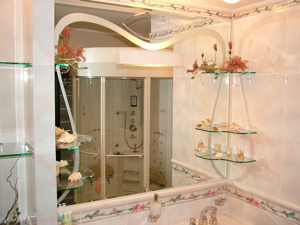 Новые полочки в ванную комнату должны соответствовать формам самой ванны, умывальника и другим предметам интерьера ванной комнаты.