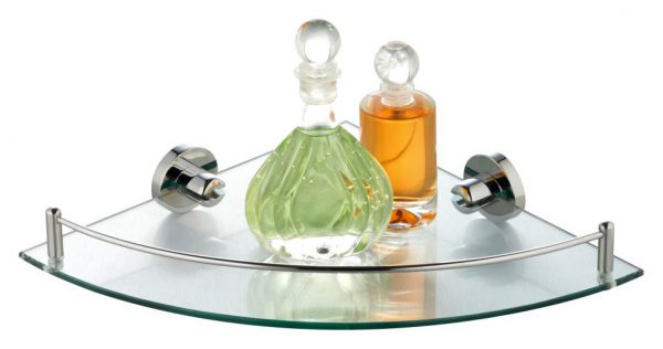 Такая полочка для ванной отличается хрупкостью, хотя для установки в это помещение изготавливают изделия из прочного стекла. Она требует тщательного ухода, т. к. при эксплуатации будет хорошо виден известковый налет.
