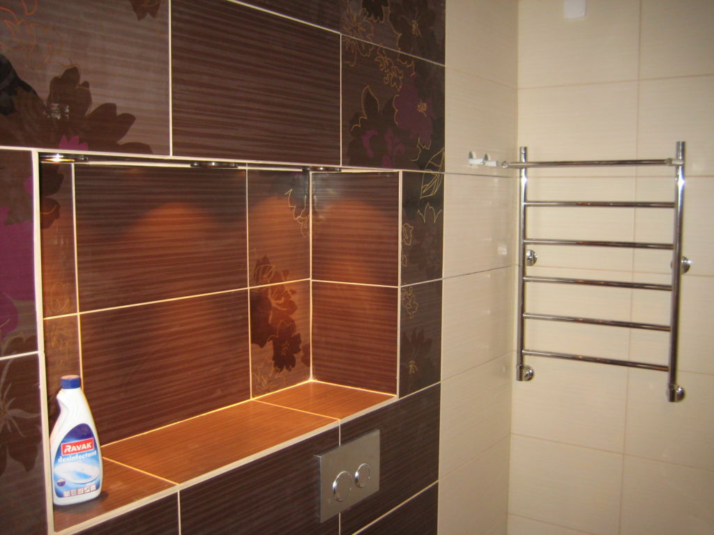 Комбинированные встроенные и навесные изделия с подсветкой являются эксклюзивом и стоят довольно приличные суммы денег. Они изготавливаются с применением сразу нескольких разных по эксплуатационным параметрам материалов. К примеру, хорошо смотрится керамическая полка с хромированными держателями.