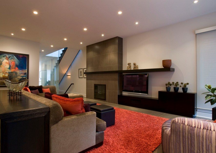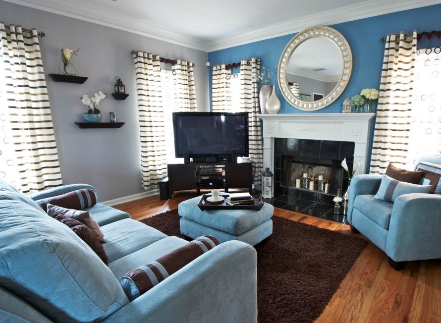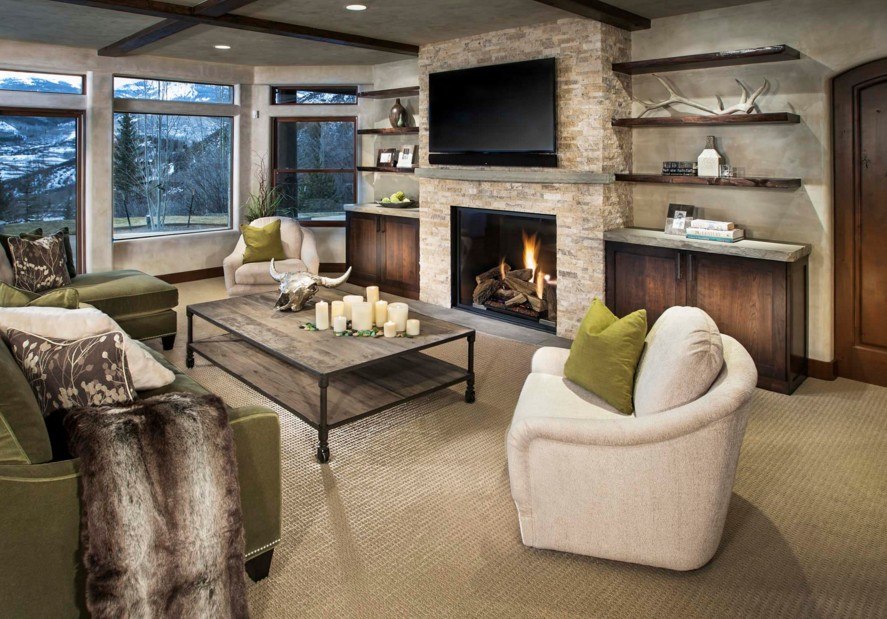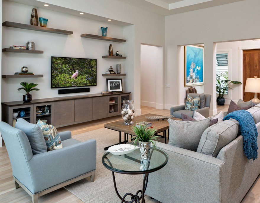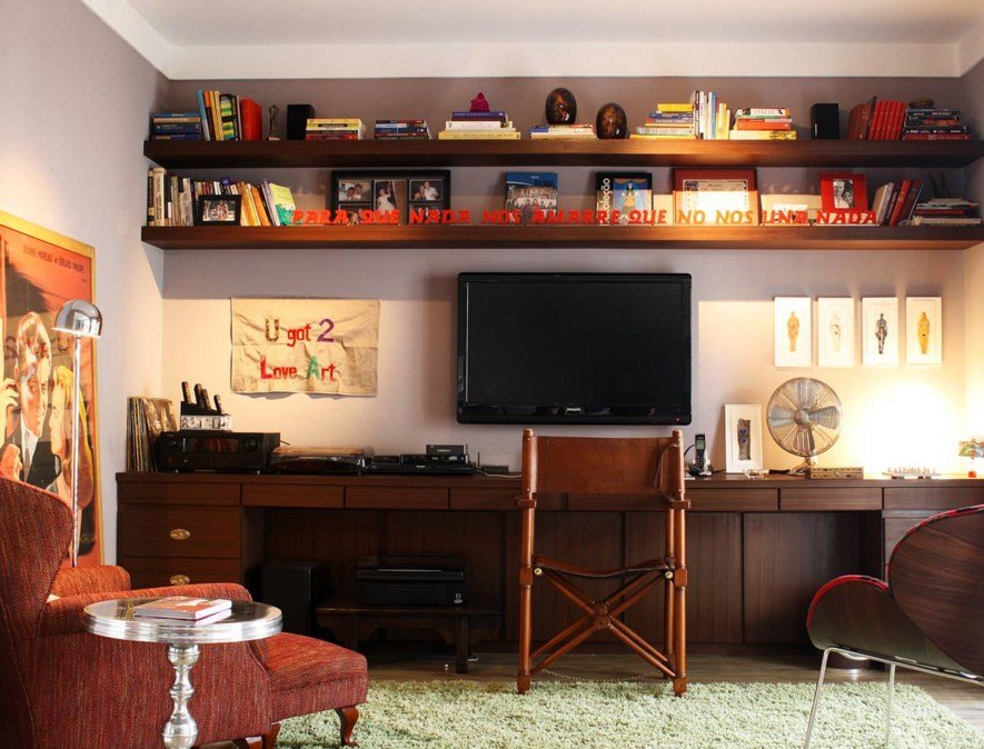 В гостиной полки развешивают на любой свободной стене, даже под телевизор, вешают полку в гостиной комнате. На фото видно, как можно расположить полки в гостинной.