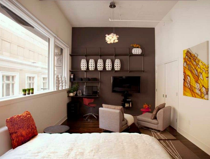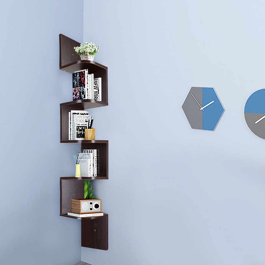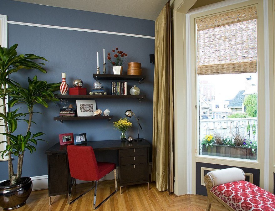 Необходимо ориентироваться на отделку стен: в случае нейтрального покрытия можно вписать яркие конструкции, а на стороне с яркой отделкой лучше обойтись без полок.