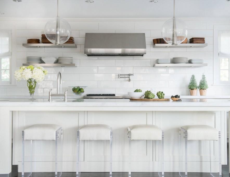 Хорошо будут смотреться навесные открытые полочки светлых или наоборот темных оттенков (белым, серым, синим или черным). |