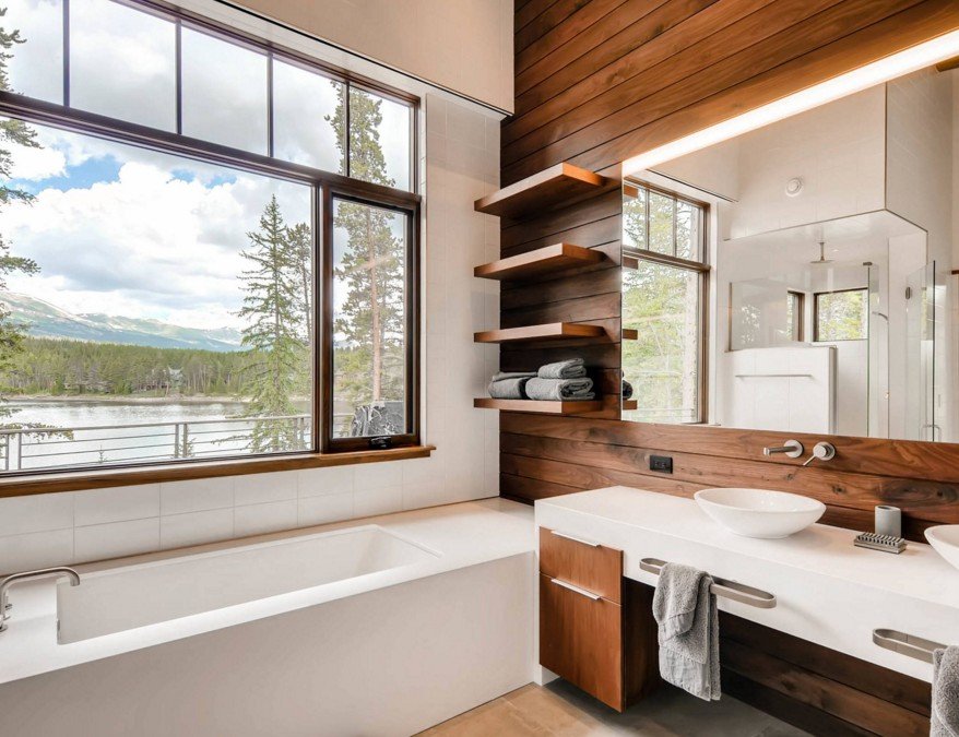 Дерево же должно быть ламинированным и специально обработанным, поскольку этот материал не самый влагоустойчивый. Деревянными можно делать полки, если в ванне есть деревянная дверь, ванна или предметы интерьера, чтобы получился гармоничный ансамбль. Это же можно сказать о кованых изделиях: зеркало в кованой раме и витиеватые полки будут смотреться очень органично!