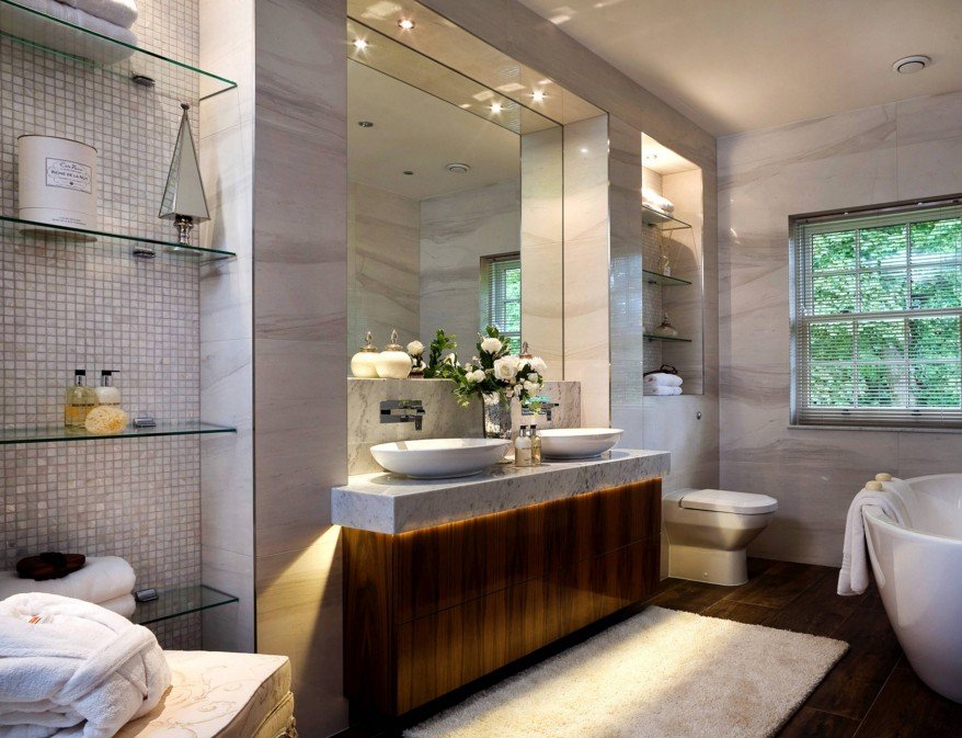 Настенные полки в интерьере ванной комнаты
