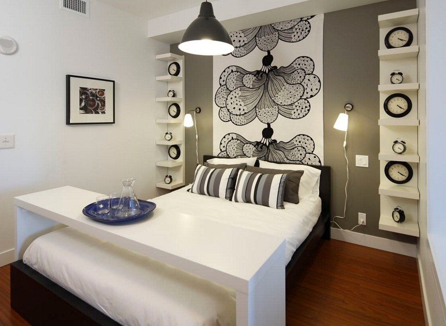 Полки у кровати или над ее изголовьем легко заменят собой тумбочки или даже небольшой комод. Размести на них ночные светильники и милые романтические мелочи, которые будут радовать тебя каждый день.