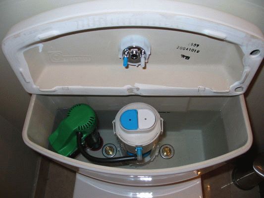 Меньше шумят при заполнении бачки для унитазов с нижней подводкой воды. Это — более современная версия устройства, описанного выше. Тут кран/впускной клапан спрятан внутри бачка — в трубке (на фото — серая трубка, к которой подсоединен поплавок).