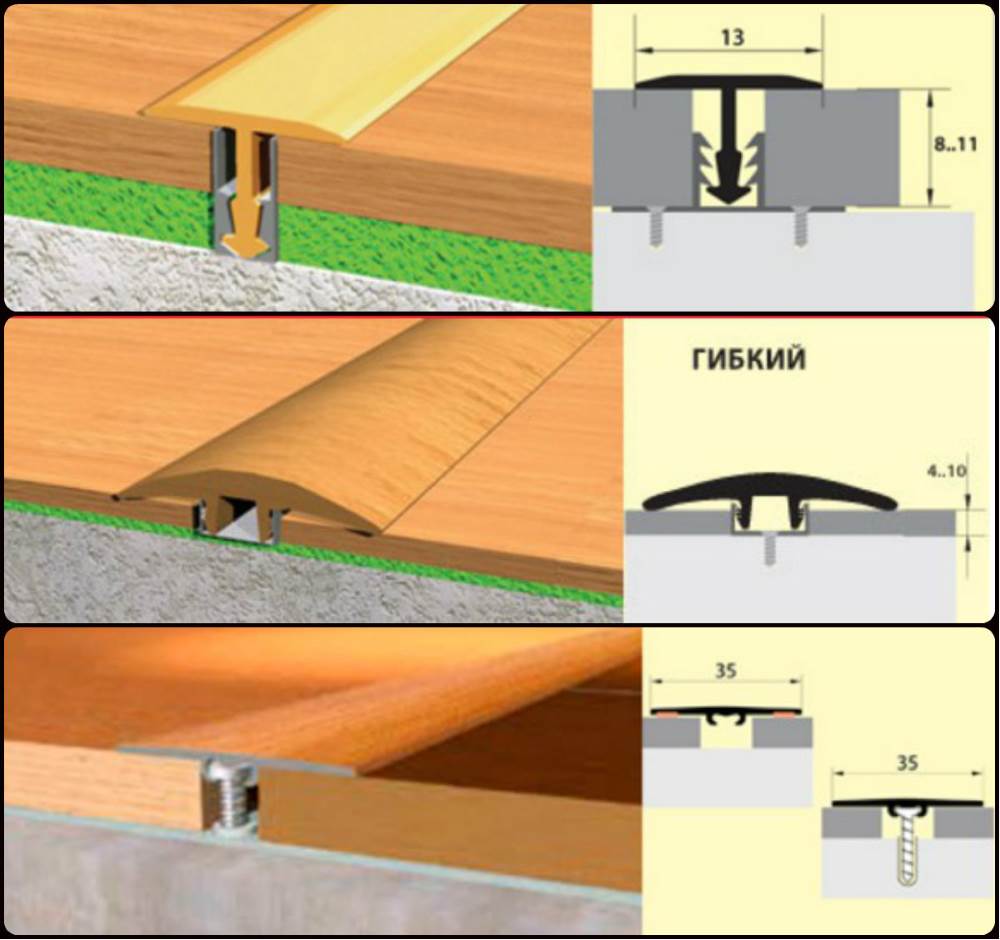 Чаще всего используют алюминиевые порожки и гибкий профиль. Поэтому подробно рассмотрим монтаж именно этих соединительных элементов.