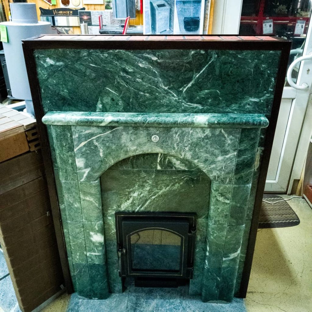 - элементы подальше от дверцы можно выложить из осадочных материалов — сланца, мрамора, ракушечника или пеноблоков;