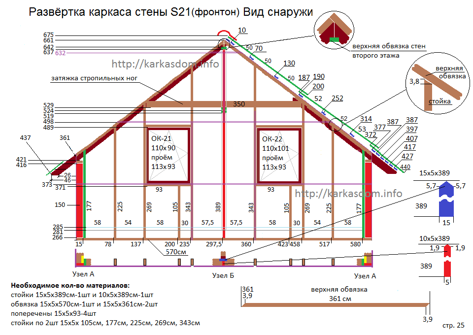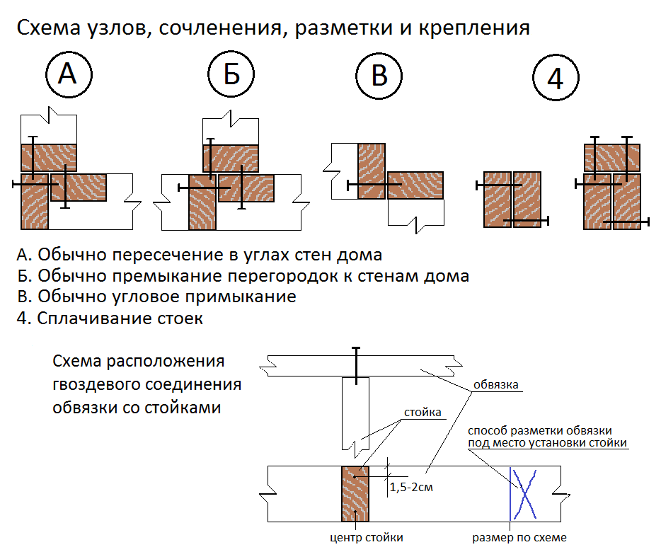 Схема узлов, сочленения, разметки и крепления составных элементов каркасно-блочного дома