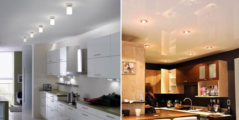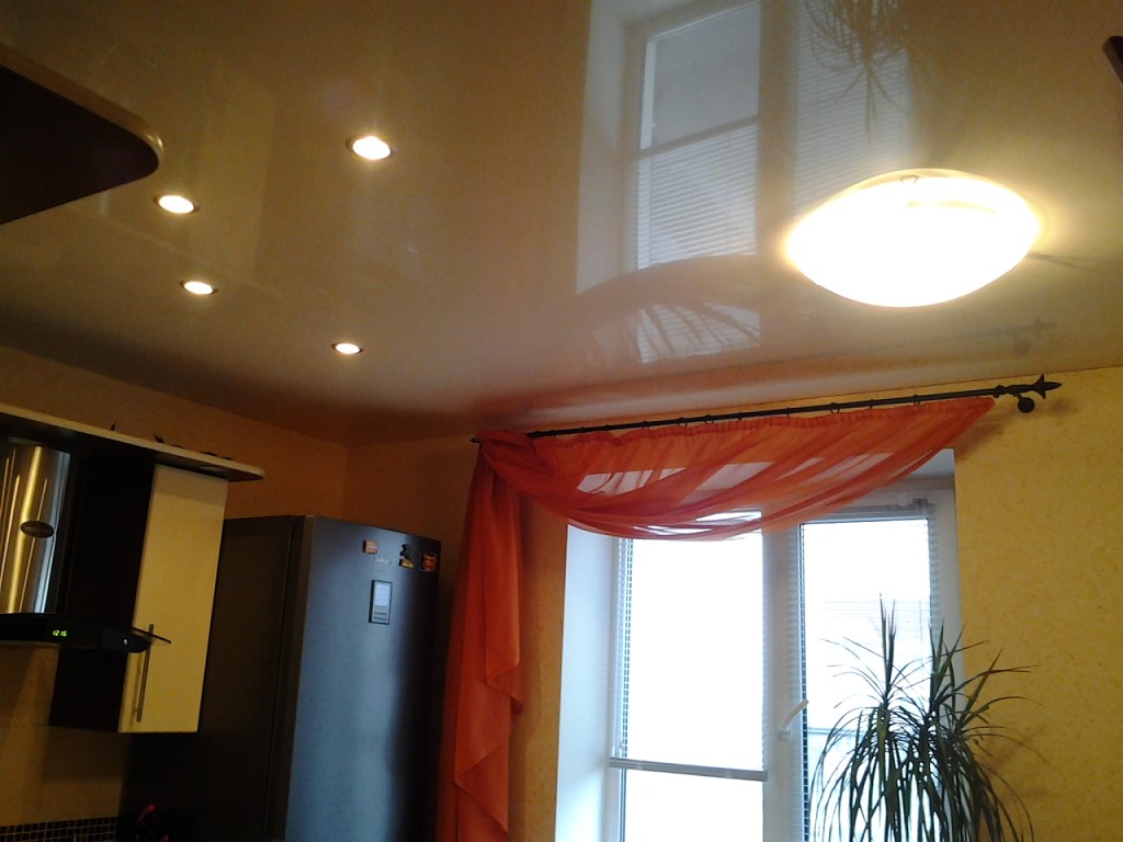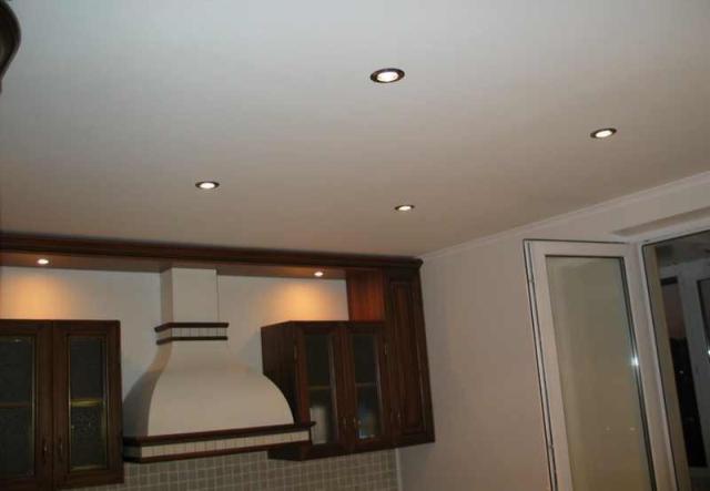 Выбор типа полотна сильно влияет на качество освещения на кухне и в других помещениях. Глянцевые полотна могут выпускаться в полупрозрачном виде, что позволяет дополнительно использовать люминесцентные лампы или светодиодные ленты для создания красивых потолочных конструкций. Матовые потолки не могут похвастаться таким качеством. Максимальная мощность встроенных светильников не должна превышать 35 Вт.