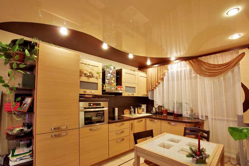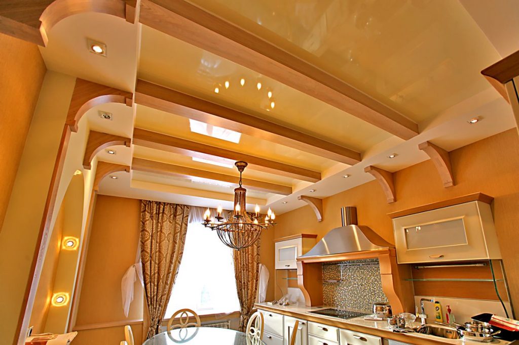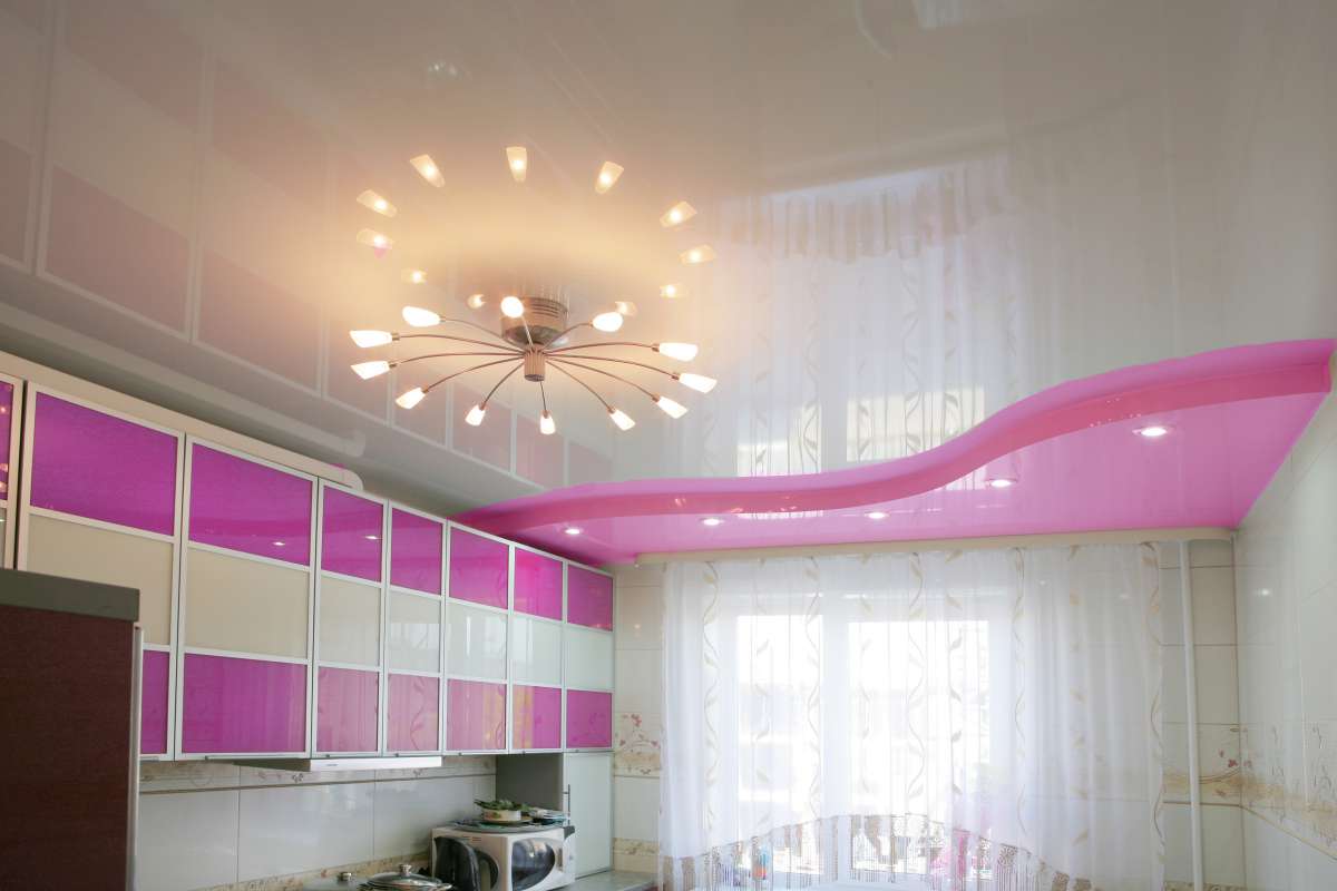 Этот вид отделки потолка как нельзя лучше подойдет для кухни, если правильно подобрать материал покрытия. Можно использовать глянцевые пленки для придания своеобразной «глубины» пространству над головой или матовые для придания интерьеру более привычного вида.