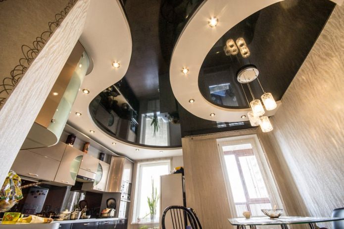 Многоуровневые глянцевые натяжные потолки в интерьере кухни классического стиля