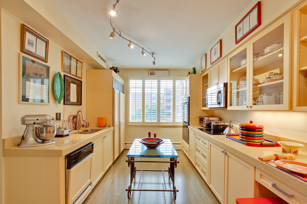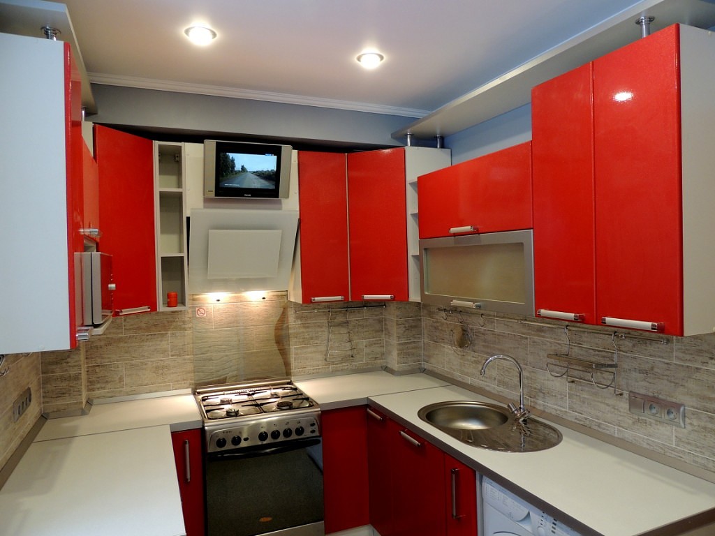 При оформлении интерьера небольшой кухни, лучшим выбором станет оштукатуривание или покраска. В тесном пространстве с высокими потолками можно использовать натяжное потолочное покрытие с глянцевой или зеркальной поверхностью, а также конструкции с использованием специальных металлических плит. Правильно подобрав цветовой оттенок с их помощью можно добиться эффекта визуального увеличения пространства.