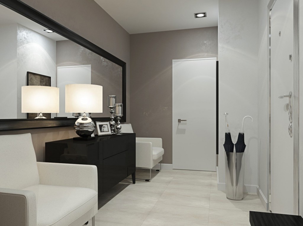 В некоторых случая можно использовать черный цвет в оформлении, однако тогда в интерьере должно быть много зеркальных и металлических поверхностей, а также другие цвета. Белый цвет не только сделает пространство шире, но и подчеркнет порядок и чистоту. Чтобы такая прихожая не вызывала ассоциации с медицинскими учреждениями, нужно обязательно добавлять элементы других ярких цветов.