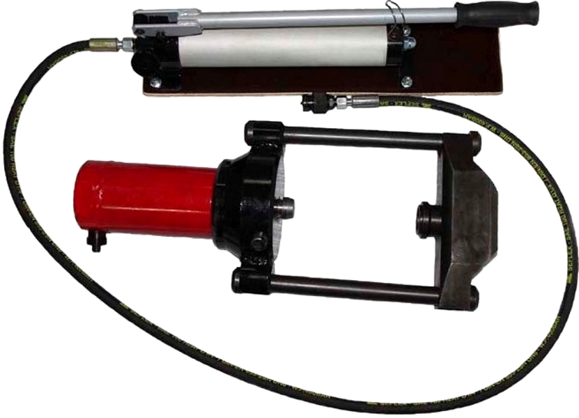 Съемник шкворней (выпрессовщик) – приспособление с ручным гидравлическим приводом для выпресовки (запрессовки) оси, соединяющей поворотную цапфу с балкой переднего моста без демонтажа подвески автомобиля. Применение данного приспособления позволяет избежать длительного и трудоёмкого процесса.