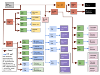 Также рекомендуется токопроводящие жилы одного сечения обозначать на плане одним цветом. Это упростит определение номенклатуры необходимой кабельно-проводниковой продукции и упростит процес ее прокладки.
