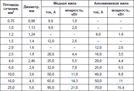 Не обязательно знать все таблицы из электротехнических справочников для определения рационального определения сечения кабеля. Оптимальное и самое распространённое сечение для вводного кабеля с медной жилой – это от 10 мм2, далее 16 и 25 мм2.
