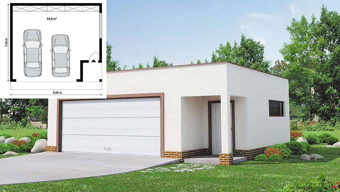 Гараж 7 на 7 метров, проект на 2 машины с навесом