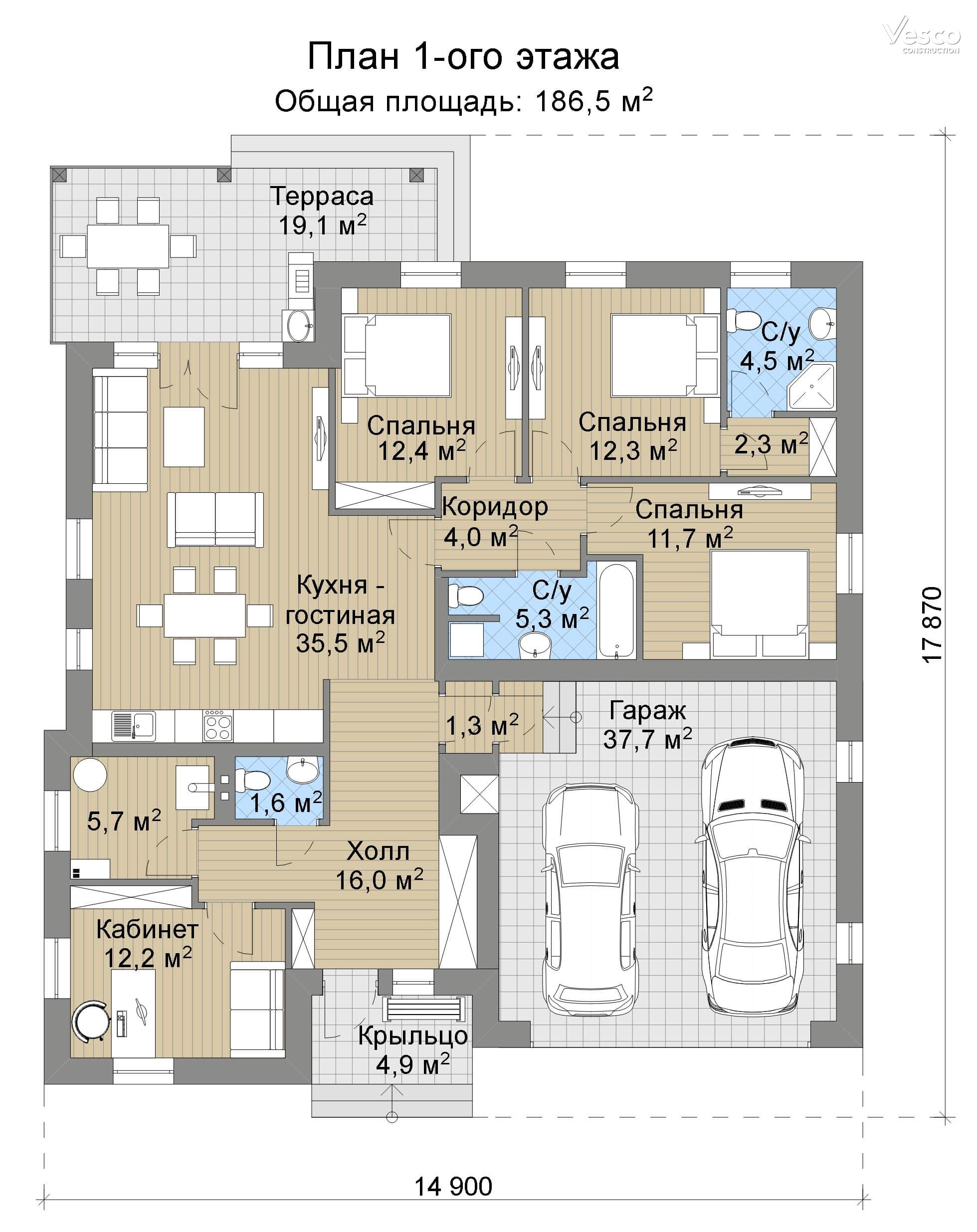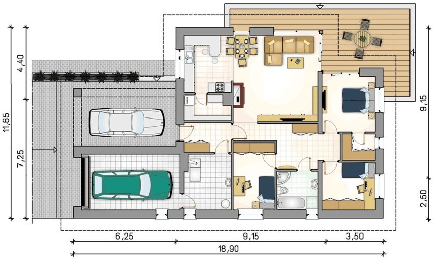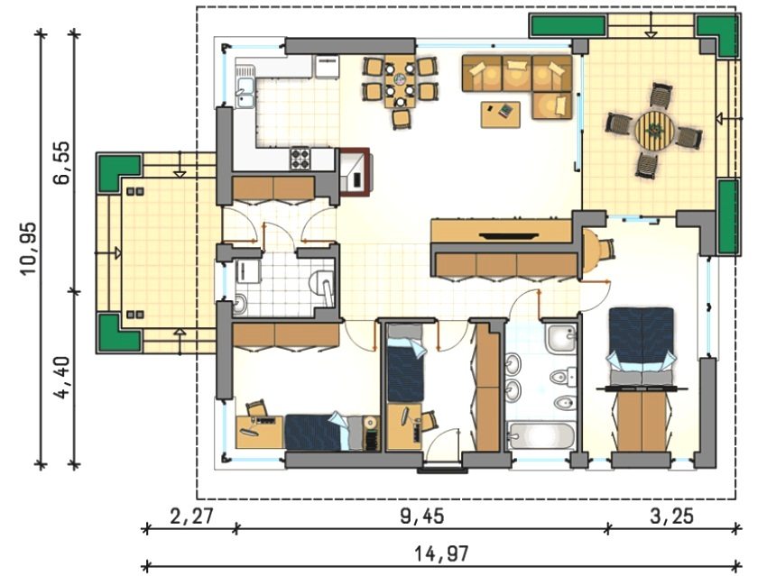 Проект 2. Планировка дома с 3 спальнями и террасой
