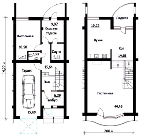 Как правило, в небольшом узком доме на первом этаже располагают гостиную, кухню, санузел, котельную, а на втором – спальные комнаты, гардероб и при необходимости дополнительный санузел.