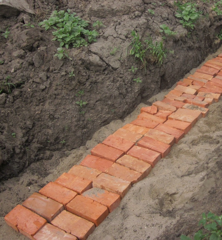 Для дополнительной защиты силовой линии под землей (к примеру, при сильных просадках грунта) можно использовать трубу либо специальное кабельное сооружение из кирпича (укладывается поперек траншеи, как на фото ниже). Использовать пустотелый кирпич запрещается. Учтите, что защита от механических повреждений кирпичами или бетонными плитами кабелей до 20 кВ, проложенных на глубине 1 метр и больше – необязательна, согласно п. 2.3.83 ПУЭ