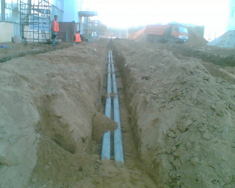 - Расположение траншеи относительно водных и сливных коммуникаций следует делать на расстоянии 1 метра, а от газовых труб 2 метра.