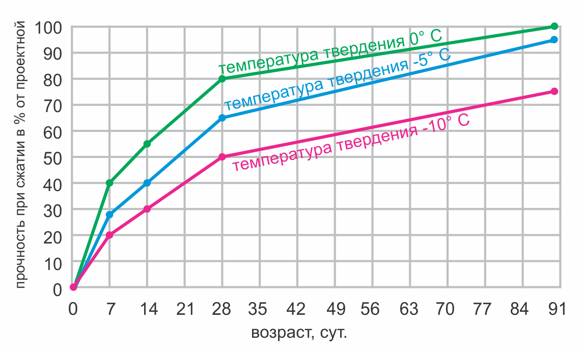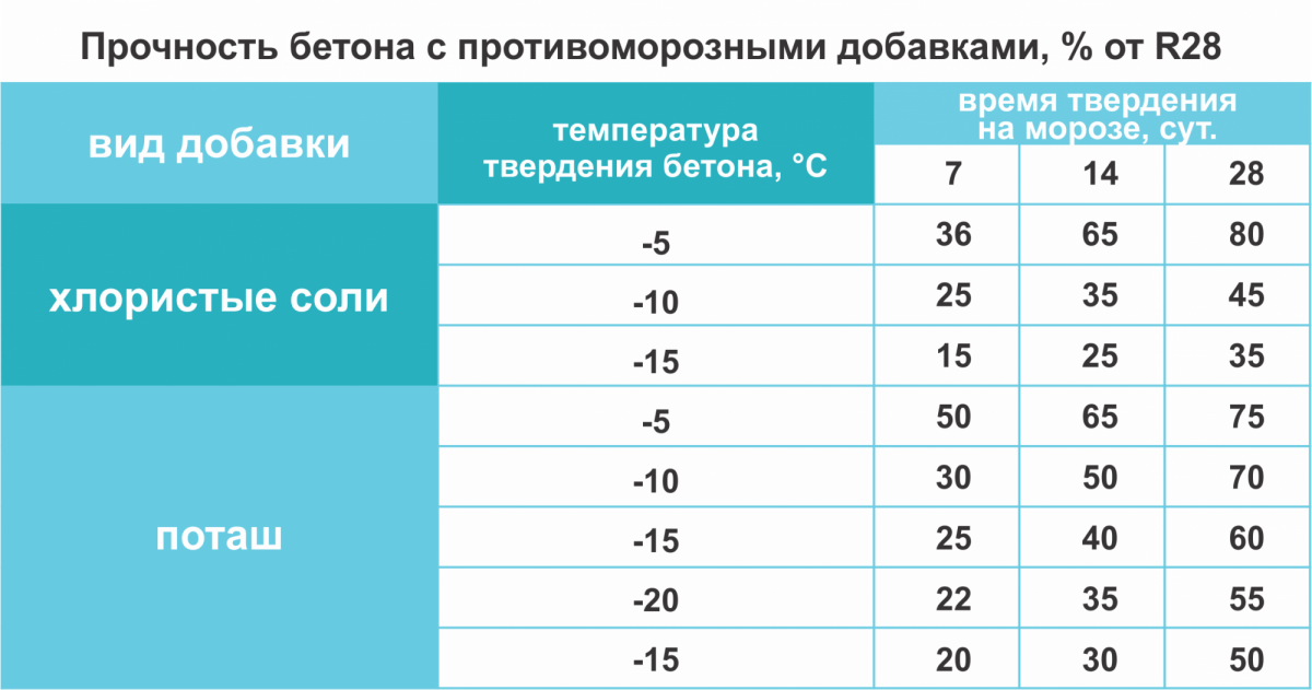 Добавление специальных веществ в раствор позволяет бетону схватываться быстрее, но свою полную проектную мощность он наберет только при плюсовой температуре.