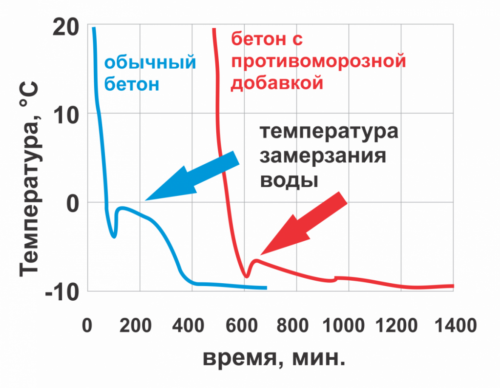 Антифриз является противоморозной добавкой, которая снижает температуру и замедляет процесс схватывания раствора. Скорость образования структур при этом не изменяется.