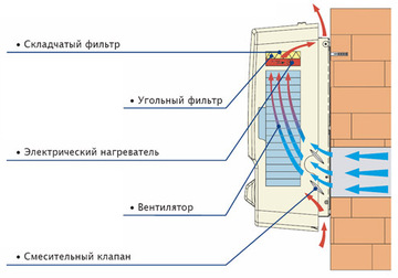 Приточное устройство устанавливается на стене внутри помещения. Воздух с улицы проходит через воздухозаборную решетку и по воздуховоду в стене, попадает на вентилятор, далее проходит через нагреватель, подогреваясь до заданной температуры и затем проходя через пылевой и угольный фильтры очищенный и подогретый попадает в помещение.