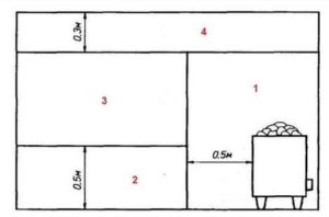 - Самая “холодная” часть, обычно ниже нижней полки. Здесь отсутствуют особые требования к электропроводке, кроме общих для бани.