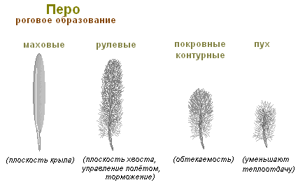 Различают длинные и особо прочные перья — маховые, — они образуют плоскость крыла; длинные и прочные рулевые перья образуют плоскость хвоста, остальные покровные контурные перья обеспечивают обтекаемую форму тела. Рулевые перья принимают участие в управлении полётом и торможении.