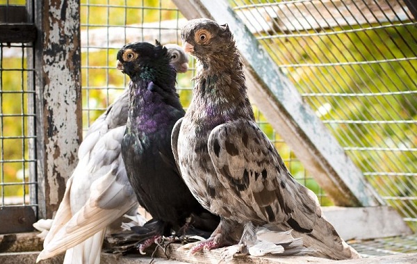 Порода включает в себя несколько разновидностей, но отличием каждой из них является лишь определённая расцветка. Окрас может быть пёстрым и однотонным: бежевым, коричневым, белым, синим, розовым, сизым, а также включать около двух и более цветов. Другими признаками следует считать: изогнутую, длинную шею; широкую, выдающуюся сильно вперёд, выгнутую полусферой грудь; средней длины ноги; походку на цыпочках.