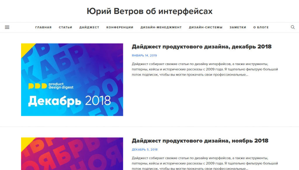 Юрий Ветров об интерфейсах – это информативный сайт о профессиональной деятельности UX-дизайнера. На портале регулярно выходят дайджесты по дизайну интерфейса. В них вы найдете новости в мире веб-дизайна и полезные инструменты, кейсы и паттерны для работы. Все они лично испробованы и изучены автором блога.