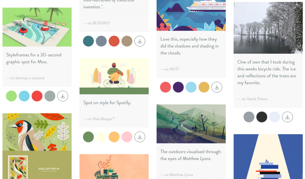 Раздел блога Inspiration действительно поможет найти свое вдохновение. В нем собраны иллюстрации, фотографии, шрифты и другие материалы, которые способны настроить вас на работу. Цветовые палитры можно загрузить в виде Adobe Swatch Exchange (.ase).
