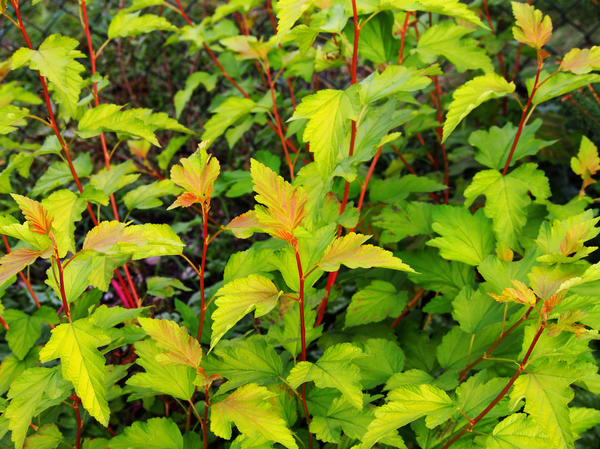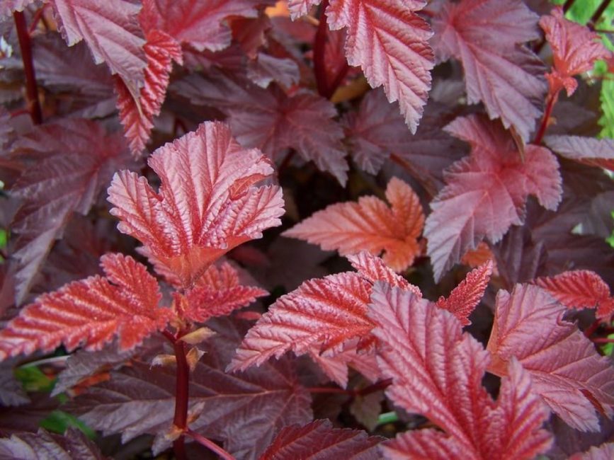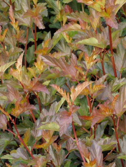 Помимо традиционной зеленой расцветки листья пузыреплодника могут быть окрашены в самые разнообразные тона: