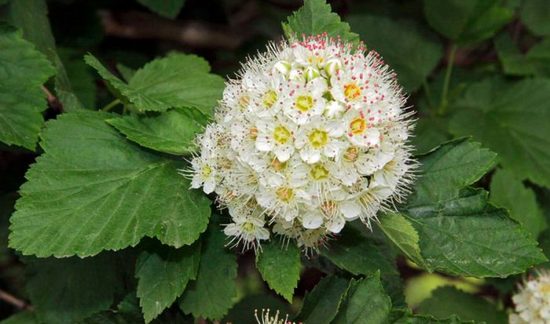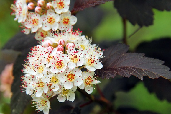 Зацветает пузыреплодник Диабло (Диаболо) в начале июня бледно-розовыми цветками, собранными в букетики-щитки диаметром до пяти сантиметров. Они не очень красивые, но нежные и ароматные. Пушистые красные тычинки придают им особую прелесть. Цветение продолжается две-три недели. Но иногда оно может растянуться до двух месяцев. А это как раз то время, когда многие кустарники уже отцвели. Поэтому пузыреплодник ценится не только за листья, но и за цветы.