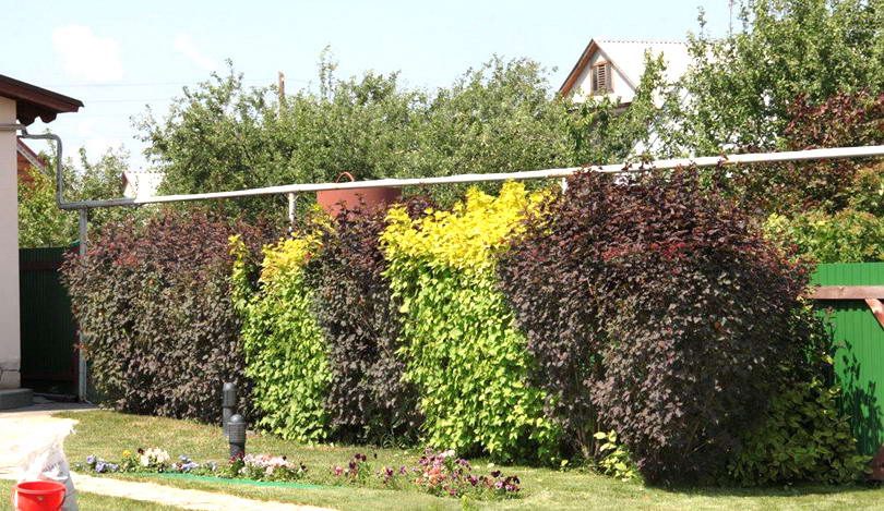 Эффектно выглядят контрастные композиции из комбинации желтолистных и краснолистных сортов пузыреплодника. Например, живая изгородь, выполненная по принципу контраста сортов растений с желтыми и красными листьями.